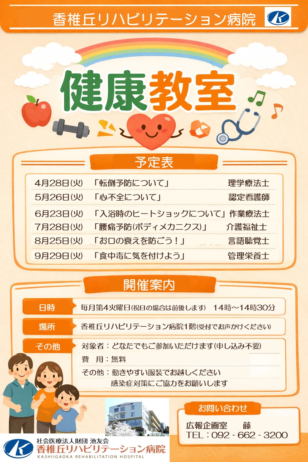 香椎丘リハビリテーション病院では、毎月第4火曜日(祝日の場合は前後します)に、健康教室を開催しております。