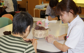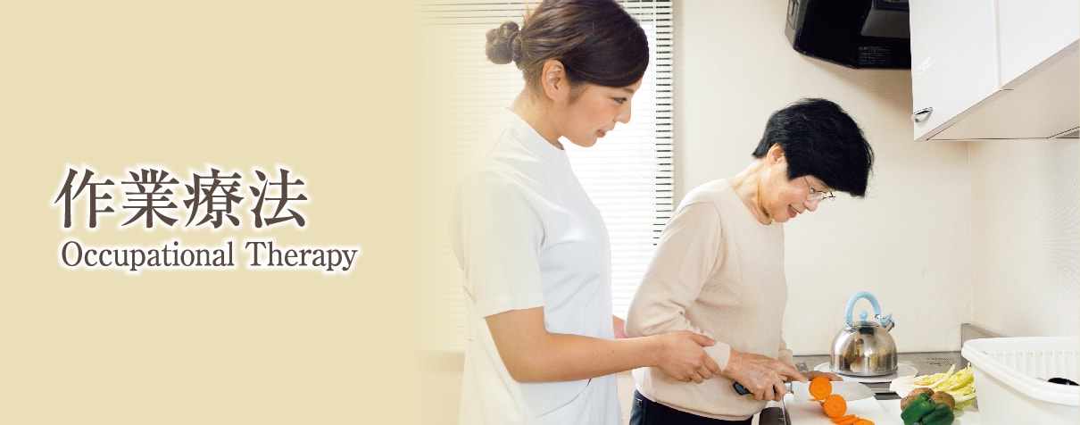 作業療法では、食事や入浴、排泄など身の回り動作の回復を図ります。また、家事動作や職場復帰のために 必要な訓練及び創造的な活動を行います。生活全般に関わることで、よりよい生活の獲得を目指します。