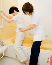 福祉用具などを用いて、自宅で安全に入浴できるように指導を行っています。入浴動作は家族にとっても介助が難しい動作のため、実際の場面で家族に介護指導も行います。